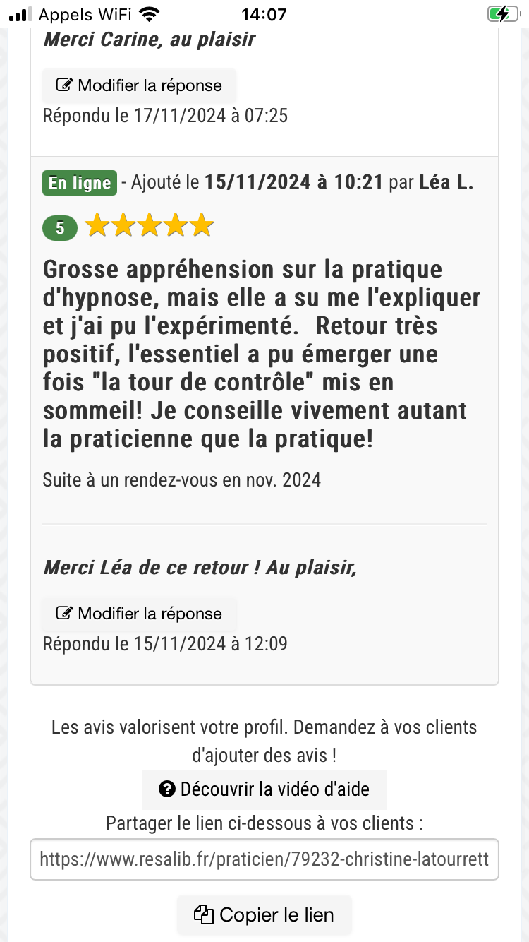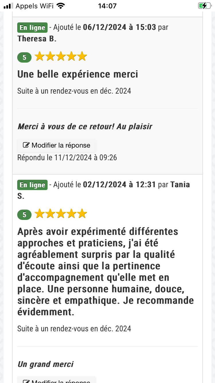 De plus le suivi hors rendez vous est top car cette personne est réellement bienveillante et s’assure que le travail qu’elle a fait sur vous porte ses fruits.
